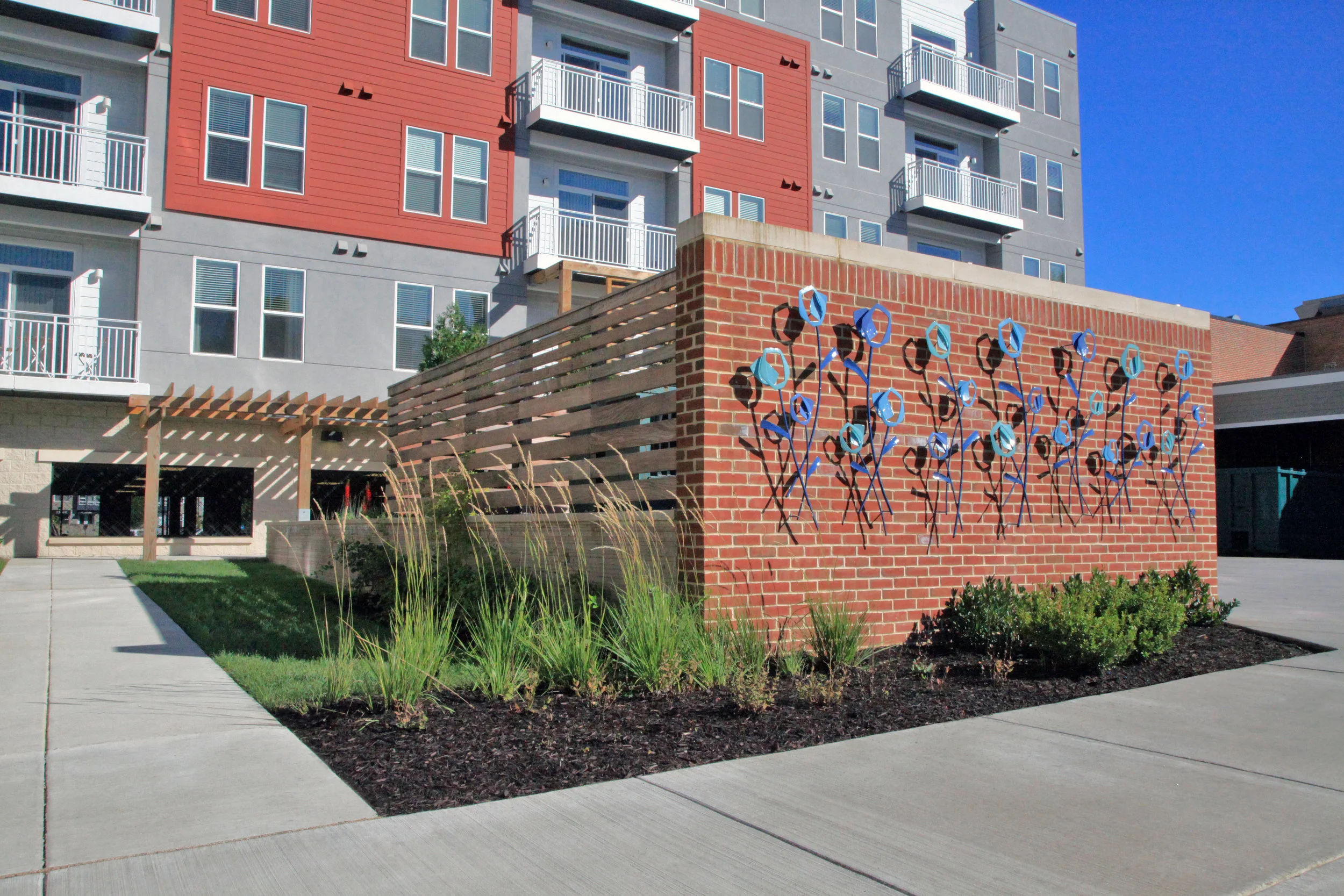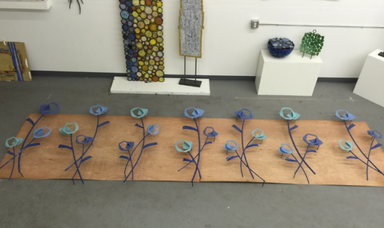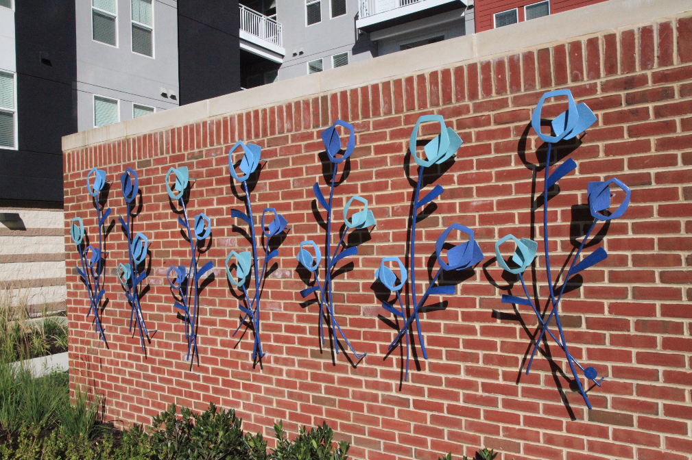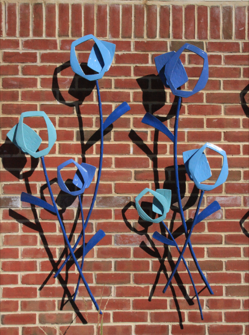 Detail image of the flowers. I suggested blues, so that the artwork would visually pop off of the brick color of the wall. The shadows add another layer of play and complexity.
